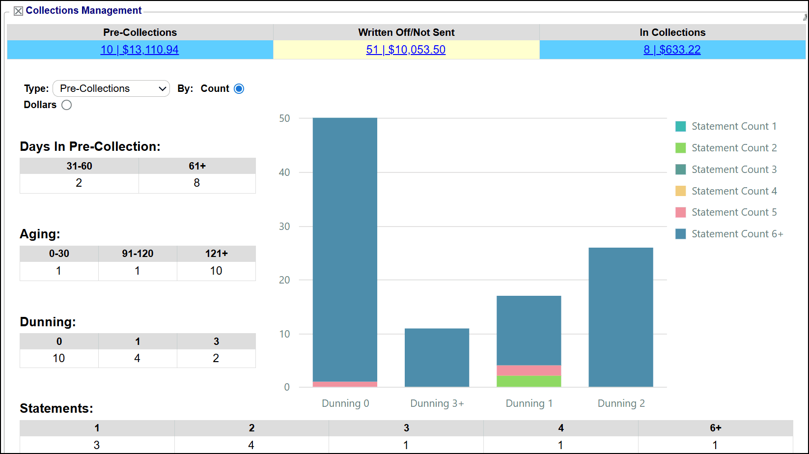 The Statement Management Dashboard provides breakdowns of the batch counts, dollar values associated with the batches, and the status of the batches.