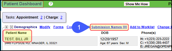 In the Demographics Panel on the Patient Dashboard, select the Submission Names link.
