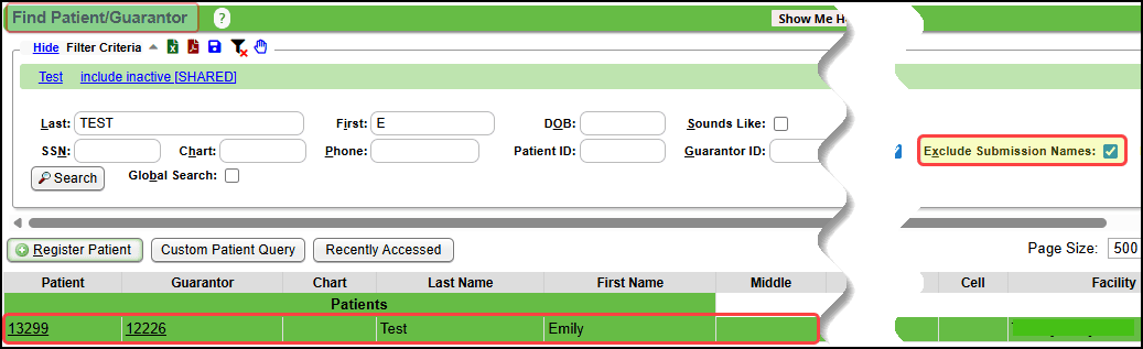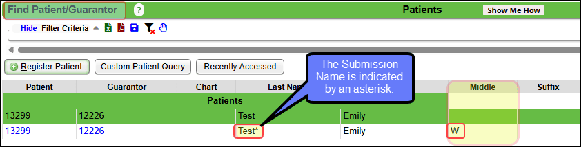 Submission Names will show on the Find Patient/Guarantor screen indicated by an asterisk.