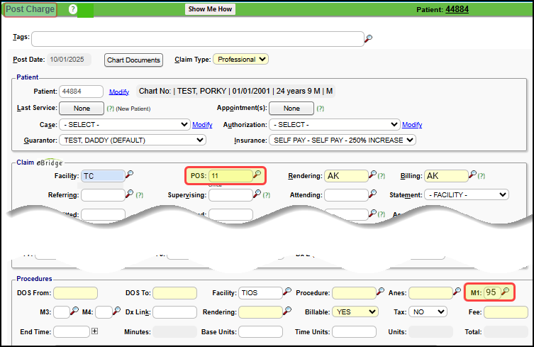 The following figure shows an example of a Medicare charge for a Telehealth visit with POS 11 and Modifier 95.
