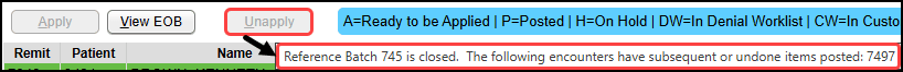 - One or more Remit Items have been altered and will need to be unapplied individually before the entire Remit can be Unapplied. The Remit number(s) will be listed.