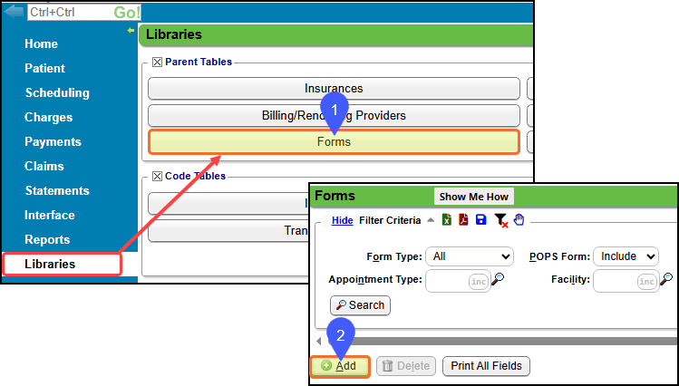 - From Libraries on the Left Side Menu, select Forms in the Parent Tables panel.