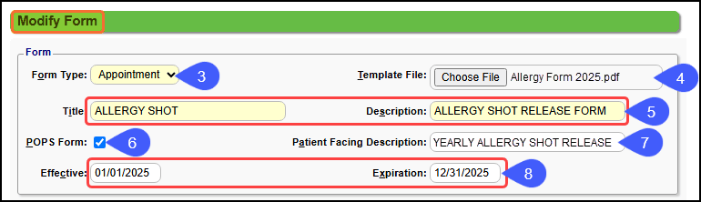 - Patient Facing Description: If you want Patients in POPS to see a different name for the Form, enter it here.