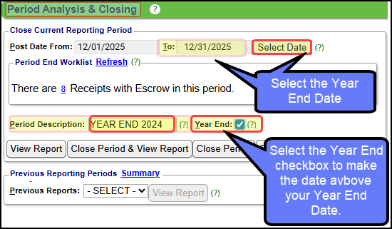 If the Year End checkbox is selected, the day after the Closing Date that was chosen will be the beginning date for all Year-to-Date report totals.